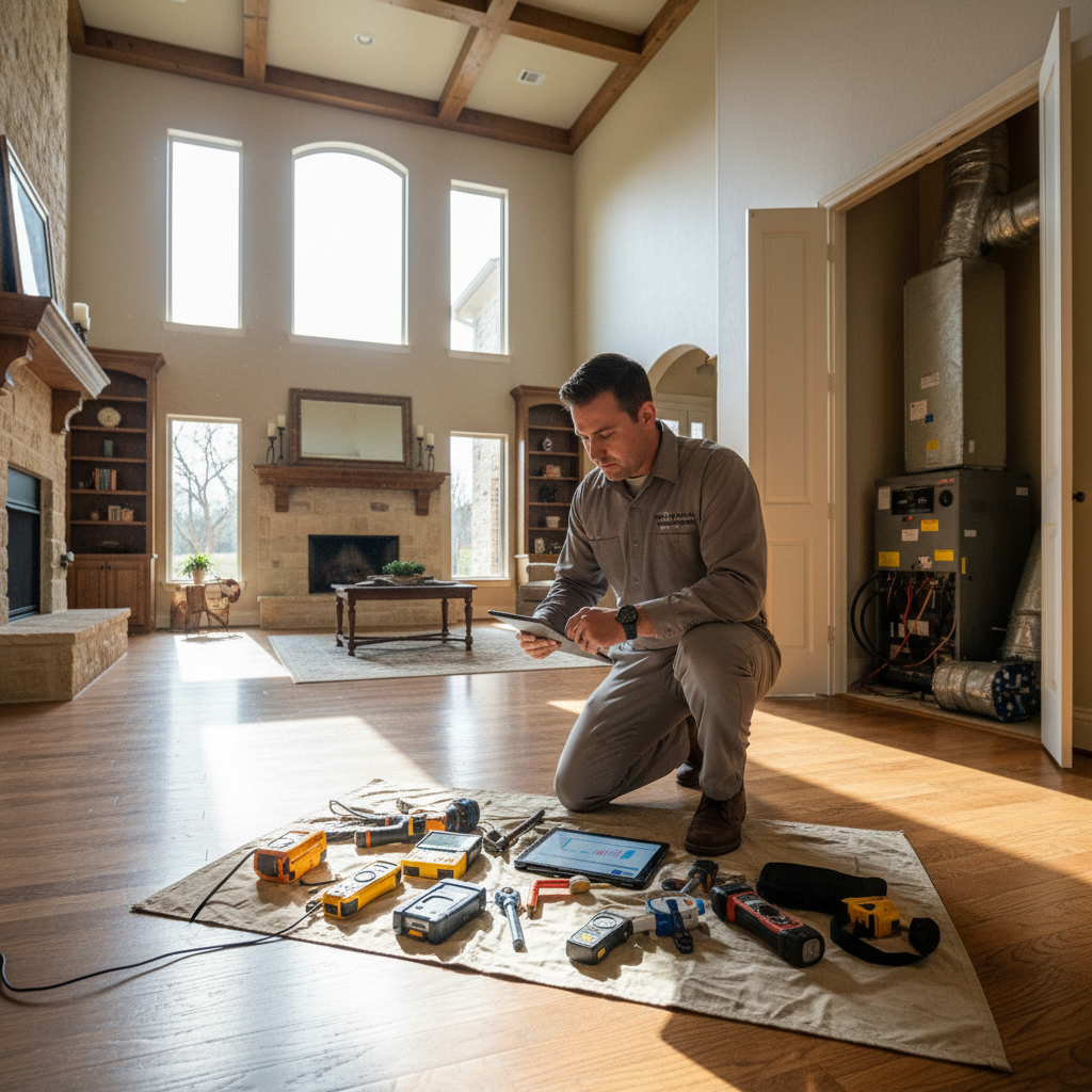 HVAC technician performing load calculation assessment on a large Texas home